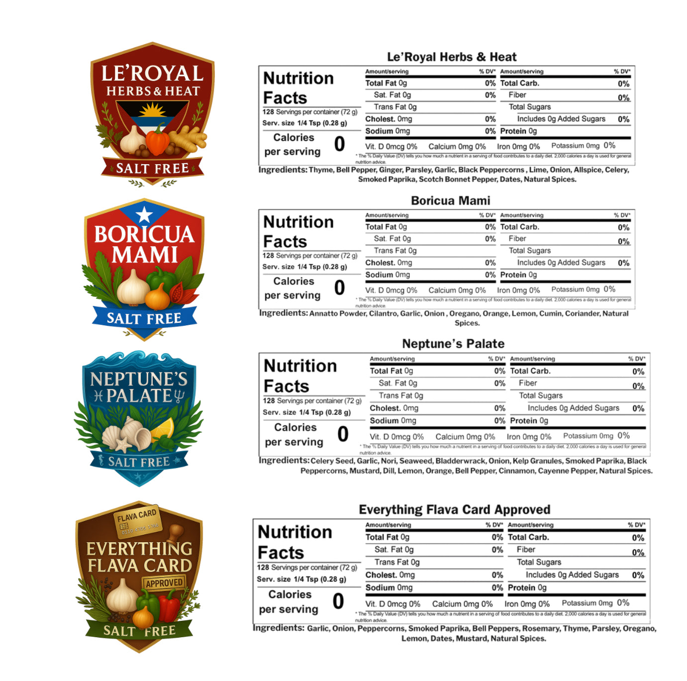 Best for: Rice, beans, sofrito-style dishes, sautéed vegetables, and Puerto Rican favorites. - Neptune’s Palate: Ocean-born flavor with seaweed and coastal herbs — redefines seafood without the sea.